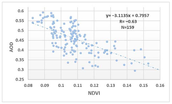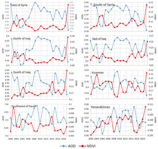 The correlation intensity between NDVI and AOD is −0.63 for the cumulative region (Figure 6), which shows the significant effect of vegetation canopy on annual dust fluctuations. According to Table 2, dust dependence on vegetation cover is less in the dust hotspots that show a lower vegetation index value (such as Yemen−Oman).