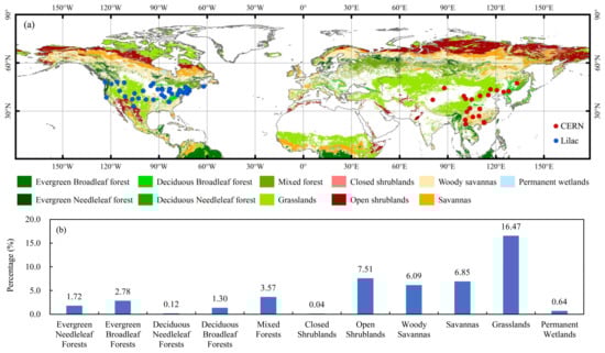 (a) The 18-year stable regions with natural-vegetation types from 2001 to 2018 and the distribution of the CERN- and Lilac-phenology observations. (b) Percentages of each natural-vegetation type over the NH.