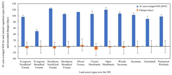 The 18-year averaged SOS for 11 natural-vegetation types and associated changes.