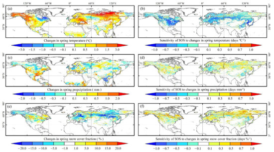 To attribute the changes in the SOS and further explore the response of different land-cover types to climate change, the present study calculated the sensitivity of the SOS to changes in spring Ts, Pt, and Sc over the NH for the period 2001–2018.
