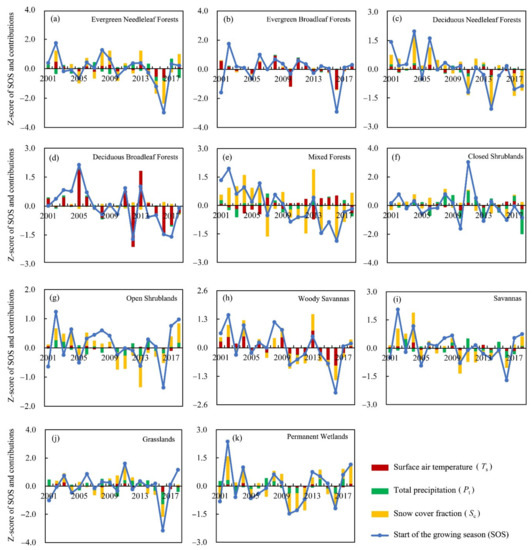 Contributions from Ts, Pt, and Sc to SOS anomalies in (a) evergreen needleleaf forests, (b) evergreen broadleaf forests, (c) deciduous needleleaf forests, (d) deciduous broadleaf forests, (e) mixed forests, (f) closed shrublands, (g) open shrublands, (h) qoody savannas, (i) savannas, (j) grasslands, and (k) permanent wetlands for 2001–2018.