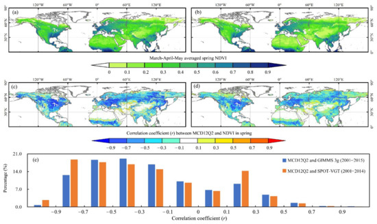 As shown in (Figure 7a,b), there are clear latitudinal and regional differences in the distribution of the spring NDVI over the NH, with a higher NDVI distributed in tropical regions and a lower NDVI distributed in arid and semi-arid regions as well as the landmasses around the Arctic. A histogram of correlation coefficients between the SOS from the MCD12Q2-C6 and the spring NDVI series from the SPOT-VGT and GIMMS 3g is presented in Figure 7e. Limited by the systematic bias of the different datasets, the SOS changes were negatively correlated with the spring NDVI from the SPOT-VGT from 2001 to 2014 by over 80% of the study area. In comparison, the results were 78% for the spring NDVI from the GIMMS 3g during 2001–2015.