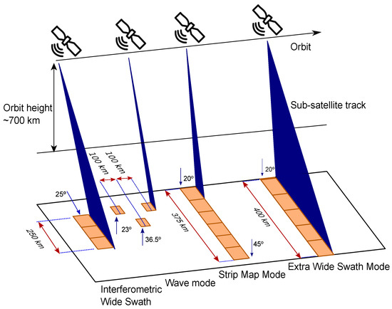 According to [27], Sentinel-1 can acquire data in four modes, which are described in the following and shown in Figure 1. First, SM is a standard SAR stripmap imaging mode. A continuous sequence of pulses with a fixed elevation angle illuminates a strip of ground. Second, in IW mode, the data are acquired in three bands using the terrain observation with progressive scanning SAR (TOPSAR) imaging technique. Third, the data are acquired on five swaths using the TOPSAR imaging technique. The EW mode provides extensive swath coverage at the expense of spatial resolution. Finally, in WV mode, the data are obtained in small stripmap scenes called “vignettes”, located at regular intervals along the swath.