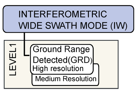 The four acquisition modes (SM, IW, EW, WV) can generate SAR level 0, level 1 SLC, level 1 GRD, and level 2 OCN products [27], as shown in Figure 2. The product used in our research is level 1 GRD with high-resolution SAR images, in IW mode, as shown in Figure 3. It consists of focused SAR data detected, multi-looked, and projected to the ground range using an ellipsoid model. Table 2 shows some examples of applications separated by operating modes.