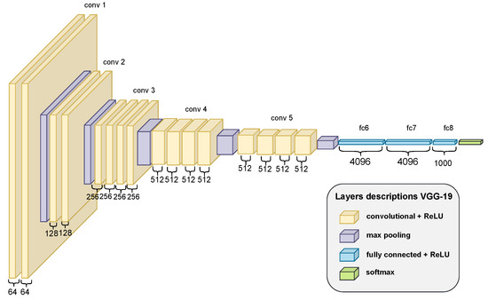 The difference between VGG-16 and VGG-19 is in the number of convolutional layers. More precisely, VGG-16 comprises 13 convolutional layers [58,59], while VGG-19 is made up of 16 convolutional layers [60,61]. This difference can be seen in Figure 5 and Figure 6. The VGG-16 is composed of: (i) conv 1—two convolutional layers with 64 channels; (ii) conv 2—two convolutional layers with 128 channels; (iii) conv 3—three convolutional layers with 256 channels; (iv) conv 4—three convolutional layers with 512 channels; (v) conv 5—three convolutional layers with 512 channels; (vi) fc6—4096 channels; (vii) fc7—4096 channels; and (viii) fc8—1000 channels. On the other hand, VGG-19 is composed of: (i) conv 1—two convolutional layers of 64 channels; (ii) conv 2—two convolutional layers with 128 channels; (iii) conv 3—four convolutional layers with 256 channels; (iv) conv 4—four convolutional layers with 512 channels; (v) conv 5—four convolutional layers with 512 channels; (vi) fc6—4096 channels; (vii) fc7—4096 channels; and (viii) fc8—1000 channels. In short, the difference between the two occurs in conv 3–5. The VGG architecture used in the research ends in the FC7 layer. Therefore, the FC7 layer with the embedding is the input for the classification algorithms, as shown in Figure 7.