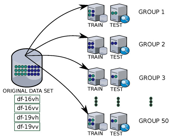 The bootstrap technique was used to ensure reproducibility and to make sure that the classifiers are evaluated under the same conditions. Bootstrap is a random resampling technique with replacement from the primary dataset [39,62]. This technique makes it possible to estimate the empirical distribution of statistics [39,63]. In this work, each data set (i.e., df-16vh, df-16vv, df-19vh, df-19vv) is resampled 50 times, as described in Figure 8. Similar to [26], each resampling consists of 320 training samples and 80 test samples.