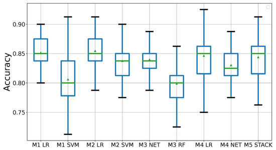 Finally, the stacking or stacked generalization technique is an ensemble method that combines multiple models to achieve better classification results [53,54], and this was also used in our study. This type of scheme can be more accurate than an individual classifier [55]. For instance, [56] demonstrates the efficiency of the technique by combining three different algorithms, DT, NB, and IB1 (a variation of the lazy algorithm).