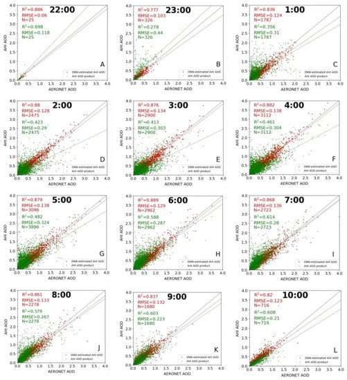 Hourly validations of AODs retrieved by the DNN model and AHI AOD product are shown in Figure 7. Since the AERONET AOD measurements at 0:00 UTC are missing, hourly validations in the daytime were conducted for 1:00~12:00 and 22:00~23:00. It should be noted that all the timestamps mentioned in this paper are UTC time, not local time. Each subfigure in Figure 7 corresponds to one hour on the time, where the estimated AOD (red dot) and AHI AOD product (green dot) at the same time were compared, and the AERONET AOD was treated as the true value. For all sets of hourly validation, R2 values of AODs detected by our algorithm (0.454~0.969) were much higher than those of the AHI AOD product (0.278~0.864), and RMSEs (0.03~0.173) were lower than those of AHI AOD product (0.140~0.440).