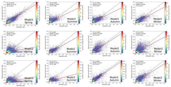 Seasonal comparisons between DNN-estimated AHI AOD and AERONET AOD for Models 1~5 (top to bottom rows). Left to right columns are corresponding to spring, summer, autumn and winter, respectively.