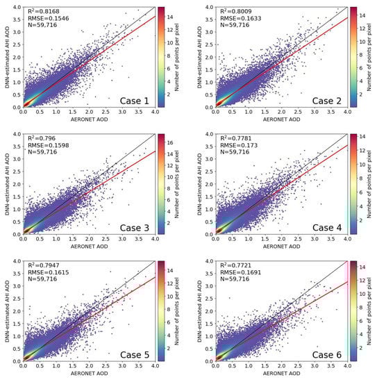 Figure 5 shows the scatterplots for our DNN-estimated AHI AOD at 500 nm against the ground-based AERONET measurements in 2020. The statistics were fitted by 59,716 matchups from retrieved AOD results at AERONET sites in China. A good correlation between them is shown with a high R2 of 0.8168 and a low RMSE of 0.1546. Since the learning sample data were generated randomly from the training sample dataset, the prediction stability of the trained models was disturbed to some extent. According to the statistics of 100 random disturbances of learning samples, the R2 varies from 0.7915 to 0.8229 with the RMSE ranged of 0.1528~0.2037. The narrow variation ranges of both R2 and RMSE mean that the prediction capabilities of these models are very similar. The result given in Figure 5 is a case of these models that can represent the average capability of AOD retrieval, and all the subsequent comparisons were conducted based on this model.