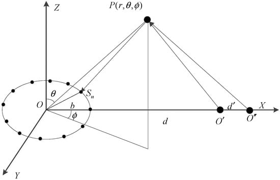 As shown in Figure 1, the UCA is used as the receiving unit and the center of UCA is located at the coordinate origin . The UCA is consisting of omnidirectional elements placed equidistantly on the circle with radius . The location of the nth elements of the UCA is denoted as . The transmitting unit is an independent omnidirectional antenna located at , and the transmitted linear frequency modulation (LFM) signal is denoted as . Assume is an arbitrary independent scatterer in the space. According to [], the echo of the scatterer received by the UCA can be expressed as: