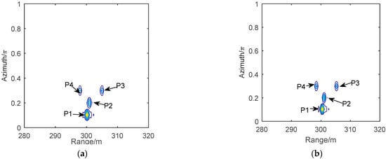 The result of the scatterers in the range dimension can be obtained through the matched filtering as shown in Figure 6. Figure 6a is the range imaging in the monostatic geometry based on [,,], and the result is and it is same as the real range of target. Figure 6b,c show the range imaging in the monostatic geometry of TR1 and TR2, respectively. According to (10), the information of contains the 3-D coordinate information of target and ; thus, from the expression of the , the range result of TR1 and TR2 is listed in Table 1. It is verified by simulation results in Figure 6b,c, respectively.