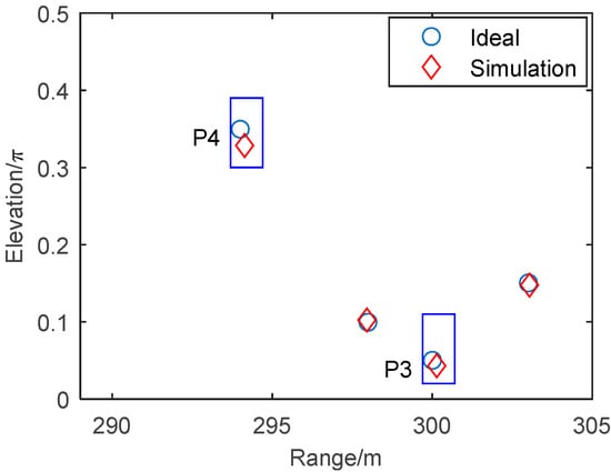 According to the 2-D imaging result of TR1 and TR2, the real range and the elevation of the target can be solved by utilizing (14)–(17). The ideal imaging and the simulation imaging by the proposed method are shown in Figure 8. The red points represent the ideal imaging, and the blue points represent the simulation results, respectively.