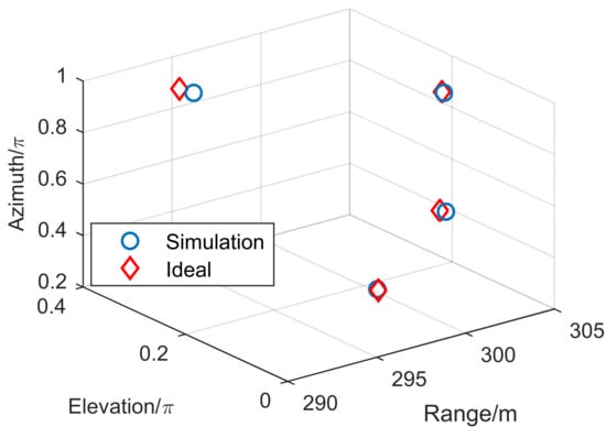 The azimuth can be obtained through FFT in terms of the OAM mode, and the real range and elevation can be solved by utilizing (14)–(17). The 3-D imaging result is shown in Figure 11, where the red points are the actual positions, and the blue points are the reconstructed positions. It can be seen that the proposed algorithm can accurately reconstruct the 3-D imaging results of targets.
