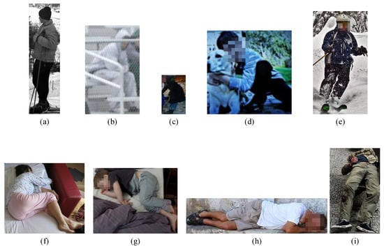 In this step, we start by collecting real background and foreground images for image composition. Because we focus on detecting victims that are partially buried in debris, we collect images of real earthquakes and collapsed buildings on the internet as background images. To obtain real foreground images of people we use the Look Into Person (LIP) dataset [], which was collected for the human parsing task. In the LIP dataset, 50K character images were selected from the COCO [] dataset, and each image was labeled using 19 pre-defined semantic classes such as left/right arm, left/right leg, and torso. Some sample images in the LIP dataset are shown in Figure 2. We manually check and delete many low-resolution, blurred, monochrome, and non-exposed body part images, as they are not suitable for composite victim images. Figure 2f–i are some good images that we can use to generate victim images.