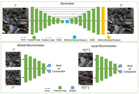 When real training data are hard to collect or annotate, researchers have verified that it is feasible to train the DL model with composite or rendered data. For example, rendered datasets are widely used in training semantic segmentation networks, because advanced computer graphics technologies allow to easily render a large number of RGB images and corresponding segmentation ground-truth [,,,,]. Detection tasks also benefit from using composite or rendered data for training. The authors of [] proposed a method to synthesize drones, planes, and cars in arbitrary poses, using these images to better train detectors. The authors of [] used 3D CAD models to augment the training data of the few-shot learning detection task. A simple cut-and-paste method was proposed in [] to generate large training data for indoor object instance detection. The authors of [] generated synthetic wires for pre-training, and fine-tuned their wire detection network on real data. Similarly, the authors of [] presented a rendered dataset for household objects detection and post estimation. To solve the shortage of training data, the authors of [] inserted smoke effects into forest backgrounds to generate synthetic forest fire images, and trained a forest fire detector. The authors of [] generated synthetic 3D faces with different poses, backgrounds, and occlusions, so as to train more robust face detectors. Inspired by [], we present a composite victim-in-debris dataset for training a disaster victim detector. Because the foreground and background images used for composition are different in color and illumination characteristics, we further propose to harmonize composite images in a novel self-supervised framework.