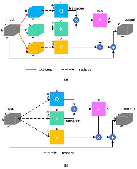 Figure 4b shows the channel attention module using the self-attention mechanism. It is similar to the pixel attention module we use, but we do not use convolution operations to construct query, key, and value. Instead, we directly reshape the features of the decoder layer, because we want to keep the channel information from the decoder. We can get a channel attention matrix :