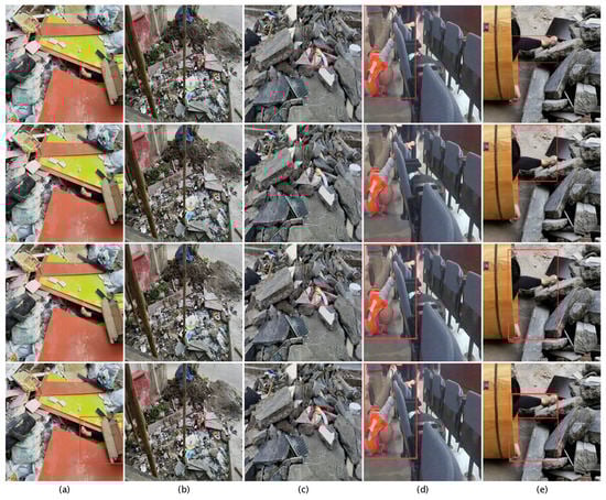 Visualization of victim detection. Five samples (a–e) are shown with red rectangles denoting detected victims. The first row is the ground-truth, and the second row is the default COCO pre-trained YOLOv5l model. The third row and the fourth row are the models fine-tuned on our composite images and harmonious images, respectively. Due to copyright and privacy issues we only show our own images.