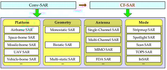 Similar to Conv-SAR, CF-SAR can also be classified by different types such as platform, geometry configuration, antenna, imaging mode, etc., as shown in Figure 2, and this classification is summarized based on the existing conventional classification. With the development of SAR, the categories will be more varied.