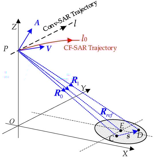 Generally, all SARs that perform non-uniform linear motion can be attributed to CF-SAR. However, in this paper, from a narrow perspective, CF-SAR refers to the SAR moving with 3D velocity and 3D acceleration []. It should be noted that ‘CF’ is a description of the SAR movement status, not a classification of radar platform type. In other words, CF-SAR is an inevitable product of the full application of Conv-SAR.