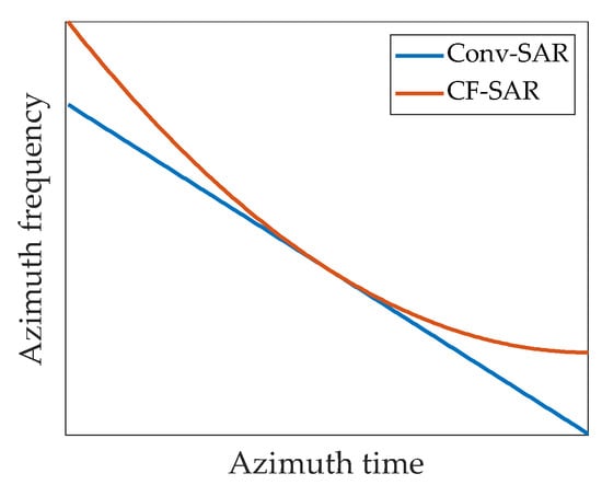 The azimuth spectrum of Equation (3) can be obtained by performing the azimuth Fourier transform. Figure 5 shows the azimuth time–frequency distribution (TFD) simulation result of Conv-SAR and CF-SAR. The spectrum coupling of CF-SAR is serious, and its TFD is no longer represented as the linear relationship of Conv-SAR, which means that it is difficult to derive the analytical formula of the azimuth spectrum by means of the principle of stationary phase (POSP).