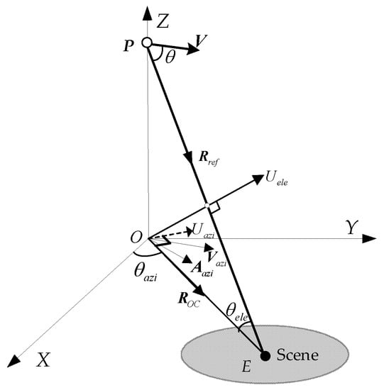 For the latter, steering commands are usually derived from the information provided by the aircraft inertial navigation system (INS) and from real-time analysis of the Doppler spectrum of the received signals. The previous analysis revealed that the Doppler spectrum of CF-SAR is very complex, and to more accurately guide the INS to control the beam steering, the instantaneous azimuth and elevation angles must be derived. For intuitive analysis, the space geometry and mechanics of CF-SAR is sketched in Figure 9.