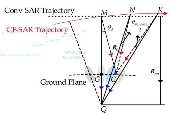 For CF-SAR with different modes, including stripmap, spotlight, sliding spotlight, and TOPS modes, etc., the main differences corresponding to the signal pattern between them depend on the beam steering and the position of the rotation center []. According to Equation (1), the echo signal of CF-SAR in Figure 3 after down-conversion can be expressed as follows: