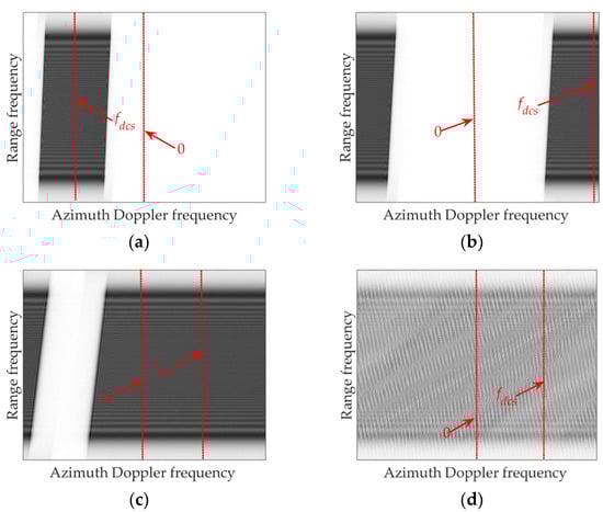 From Equations (8) and (9), the Doppler center of the spectrum can also be calculated when . According to the beam-steering characteristics of different imaging modes (c.f. Section 2.3.5), and combined with the calculation results of the Doppler center, we can find that the Doppler support region of CF-SAR is more complex.