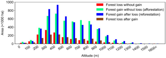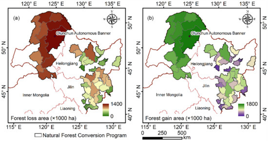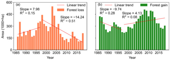 | Period (Year) | Forest Loss Area (×1000 ha) | Forest Gain Area (×1000 ha) | ||