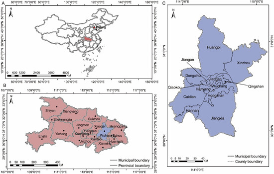 (A) Hubei Province in China, (B) Wuhan City in Hubei Province, and (C) Wuhan City divided into thirteen districts.