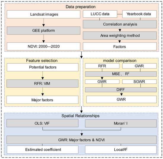 The methodology of this study was organized as follows (Figure 2). First, we performed data preparation, calculating NDVI data from Landsat images and conducting the area weighting method to obtain the socio-economic data at a resolution of 1 km; then, we proceeded with two transitional works, a unified importance measure of all potential factors using RFR, and any attempt to compare the performance of the possible model used for the main factors and NDVI; finally, GWR models were applied to assess the correlation between vegetation coverage and major human activities.