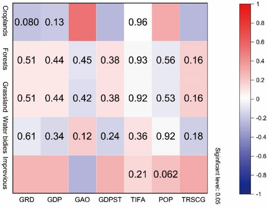 Separate correlation analysis models were constructed in this work using each socio-economic factor in turn with different LUCC types and selected the type that was most relevant to each factor. Figure 3 revealed that the impervious surface type correlated the most with GRD (p < 0.05, = 0.268), GDP (p < 0.05, = 0.263), GDPST (p < 0.01, = 0.298), and TIFA ( = 0.158), whereas the cropland type was selected to match the POP (p < 0.01, = 0.307), GAO (p < 0.01, = 0.529), and TRSCG (p < 0.05, = −0.252). In addition, the SLR results of CERA factor selected the final model with only the forests type as the independent variables, which meant forests can explain the CERA factor well (p < 0.01, = 0.632).