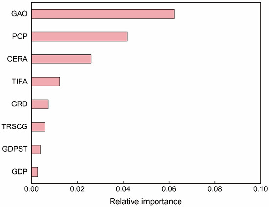 The RFR model was constructed to screen the socio-economic factors that contributed significantly to NDVI. In this selection process, the NDVI data from 2000 to 2020 were set as the dependent variables, and the socio-economic factors were the eigenvalues of the model ( of validation set = 0.61, MSE = 0.01, parameter default). The model results demonstrated that GAO and POP factors had the greatest contribution to NDVI (Figure 4).
