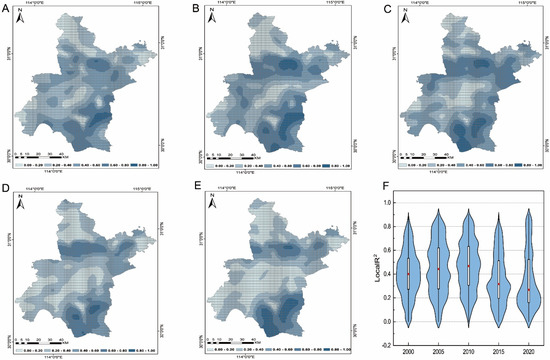 Spatial distributions of LocalR2 in Wuhan in 2000 (A), 2005 (B), 2010 (C), 2015 (D) and 2020 (E) at a gridding resolution of 1 km based on GWR model (F).