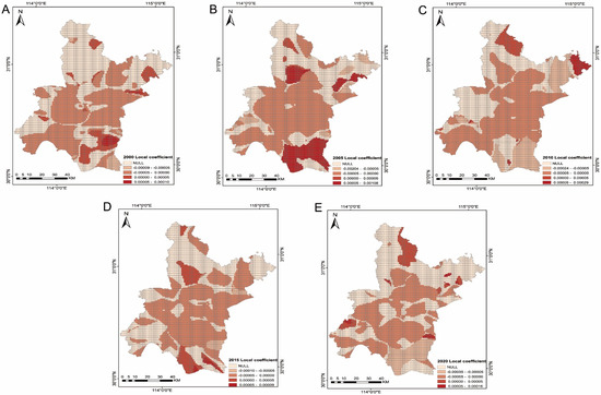 (A–E) Local estimated coefficients for POP of NDVI in Wuhan at a gridding resolution of 1 km calculated by GWR.