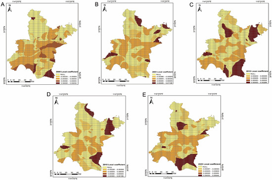 The local estimated coefficients of factors that passed the 0.05 significance test for approximately 8980 grids were visualized on the administrative map to intuitively identify varying directions and spatial characteristics. The results demonstrated obvious geospatial heterogeneity in the estimated coefficients of variations for all five years, because regardless of whether a positive or negative correlation exists between two drivers and NDVI, and the strength of both relationships varied according to spatial variations. This is similar to the outcomes of Ma Bo et al., who all found that the impact of human activities on vegetation varied with spatial variation [19,37].