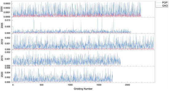 The GWR with Gauss function was configured with an annual average NDVI as the dependent variable and two vital factors in the corresponding years as the independent variables. Among the results of the GWR model (Table 4), each local estimated coefficient represented the influence of a factor on NDVI over the local regions and a positive number means a favorable effect [29]. To divide the local estimated coefficient data into valid and invalid components, we used the adjusted critical t-values to define significance, and the original significance level was 0.05. This step could solve the problem of multiple hypothesis testing in GWR [41]. Results showed the positive and negative effects of POP and GAO factors on NDVI, suggesting some temporal heterogeneity in the relative influences of human activities on NDVI. The proportion of positive local estimated coefficients for the POP factor had always been dominant and reached the highest value of 75.70% in 2010. Meanwhile, the GAO factor began with predominantly positive coefficients, but the share of negative coefficients increased significantly after 2010.
