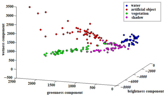 As can be seen from Figure 4 and Figure 5, the water bodies correspond to relatively high and low values in the wetness and greenness components, respectively; vegetation has a relatively high value in the greenness component; meanwhile, shadows and man-made objects have more diverse reflectivity due to the variety of their species. By adding an auxiliary line Iwetness = Igreenness to Figure 5, it is easy to see that the corresponding pixels of water bodies are all located below the auxiliary line, and the vegetation and shadows are all located above the line; therefore, the condition of “Iwetness > Igreenness” can easily be used to divide the water bodies from the shadows and vegetation. However, some man-made objects still fall below the auxiliary line; one can see a clear gap exists between the greenness component of these man-made objects and the greenness component of the water body. Therefore, the thresholding condition “Igreenness < K” was set to distinguish the water bodies from the man-made object.