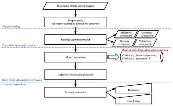 First, the original remote sensing image data were pre-processed with radiometric calibration and atmospheric correction to eliminate the deviation caused by atmosphere absorption and scattering of light. Second, the correlated remote sensing image information was converted into uncorrelated linear information using TCT; four components were obtained: brightness, greenness, wetness, and yellowness. Third, based on the greenness and wetness components, the difference between the water body and other ground-based objects (vegetation, man-made object, shadow) was analyzed and the model was constructed to extract water body information. Finally, an accuracy assessment was carried out by calculating the Kappa Coefficient, overall accuracy, and user accuracy.
