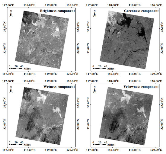 The original remote sensing image was pre-processed with radiometric calibration and atmospheric correction to eliminate most of the deviation caused by the atmosphere, and Environment for Visualizing Images (ENVI) version 4.8 software has been used to perform statistical and visual analyzes on satellite imagery. Then, a TCT was performed to obtain the four components, brightness, greenness, wetness, and yellowness, using the weights in Table 1. The results are shown in Figure 4.