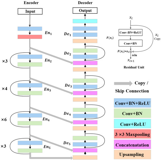 where x l and x l + 1 are input and output of the l-th unit; h ( x l )   is an identity mapping, i.e., h ( x l ) = x l ; F is a residual function; W l is the weight of the l-th unit; f ( y l ) is an activation function (ReLU). These residual units can facilitate the training of networks and gain accuracy from considerably increased network depth.