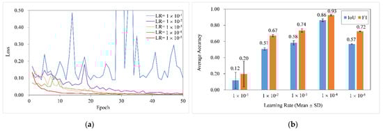 Figure 5. (a) Different learning rates on the validation set in 50 epochs; (b) average accuracy and standard deviation under different learning rates.