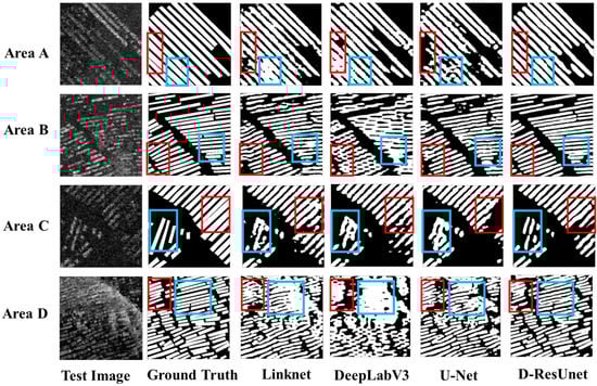 Figure 6 shows the extraction results of different DL methods in four randomly selected sub-areas of the study area, with black pixels representing the ocean background and white pixels representing the extracted FRA areas. Omissions and adhesions are common problems in binary semantic segmentation tasks. The red rectangle shows the FRA area, which can be easily missed, and the blue rectangle gives the area where the FRA extraction results are prone to adhesions. As seen from the resulting maps, the LinkNet has poor integrity in the red rectangles of Area A, B, C, and D. In addition, obvious adhesions occur in the blue rectangles of Area A and D. Furthermore, the extraction results of the LinkNet model has relatively inward shrinking edges in all test areas. The DeepLabV3 has more serious adhesions, especially for the blue rectangles in Area B and D. The narrower gaps between two neighboring floating rafts cannot be identified accurately on the resulting maps. In addition, the edges of the FRA areas partially overflow and show an irregular wavy shape. The U-Net model has obvious omissions in red rectangles of Area A and C, which shows the poor extraction capability for these FRA areas. Meanwhile, less adhesion exists in the U-Net extraction result compared to LinkNet and DeepLabV3. Compared with the above models, the proposed D-ResUnet model has better integrity and more accurate edges, where the gaps between two adjacent floating rafts can be identified and displayed clearly. As can be seen from the resulting maps, fewer omission and adhesion areas exist in the test area from A to D with the D-ResUnet model.