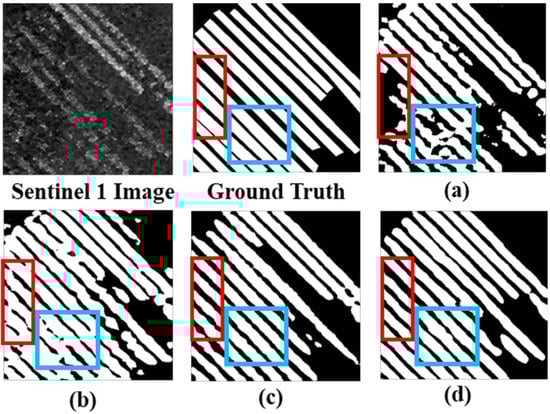 Figure 8. Resulting maps of the application experiment. Black pixels represent the seawater and white pixels represent the extracted FRA areas. Red rectangles (a–d) are areas where the FRA area is easily missed.