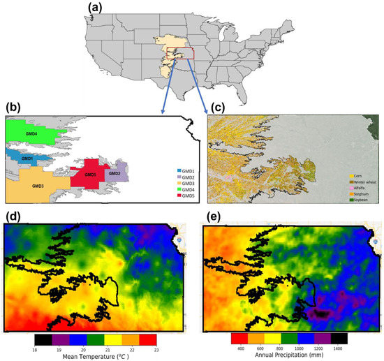 (a) Extent of the High Plains Aquifer (HPA), (b) Kansas portion of HPA and five groundwater management districts (GMDs), (c) distribution of major crop types, (d) mean annual temperature (°C) and (e) annual precipitation (mm) in 2016, a year with normal hydrometeorological conditions.