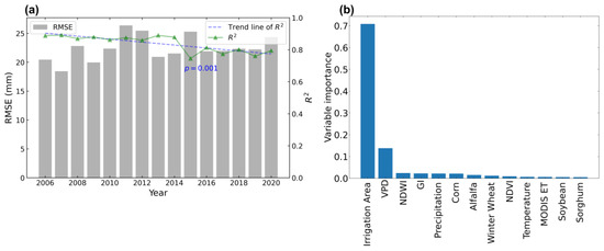 Results from Experiment A (random split), including (a) annual root-mean-square error (RMSE) and coefficient of determination () from 2006 to 2020; Linear regression of shows a statistically significant declining trend (); (b) Random forest variable importance scores.