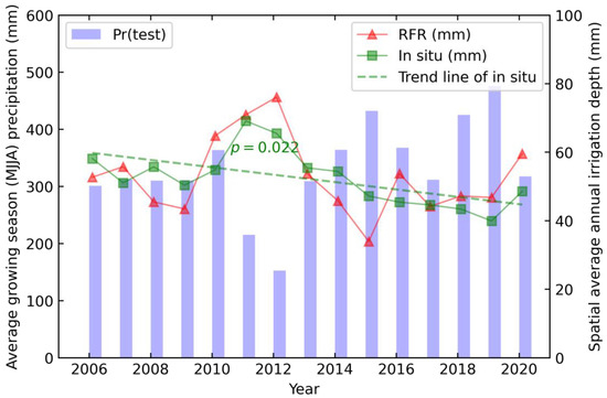 Annual growing season (May, June, July, August, MJJA) total precipitation (bars) and irrigation amounts as depth (mm) from the RFR (red, triangle) and in situ records (green, square) for the entire Kansas HPA from 2006 to 2020 in Experiment A (random split). Linear regression (green, dashed) of the in situ irrigation amount has a decreasing trend (. The irrigation amount estimated by the RFR does not have a statistically significant decreasing trend.