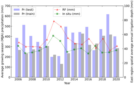 Annual irrigation amounts from the RFR (red triangles) and in situ records (green squares) for the test data (eastern portion of Kansas HPA) in Experiment B (spatial split). The growing season (May, June, July, August, MJJA) total precipitations for training (grey bars) and test (purple bars) portions, respectively, are also shown.