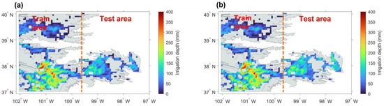 Spatial distribution of (a) in situ and (b) RFR estimated irrigation amounts in Experiment B (spatial split) for a medium model performance year (2011). The red dashed line divides the training (western) and test (eastern) portions.