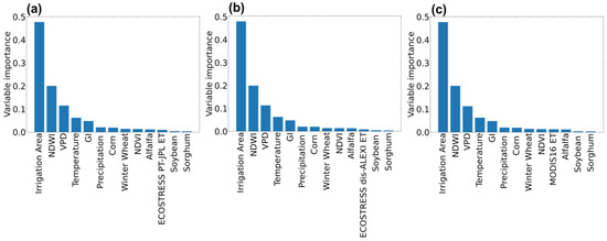 Input variable importance scores calculated by the RFR (averaged from 200 times of repeated tests) using (a) ECOSTRESS PT-JPL instantaneous ET, (b) ECOSTRESS dis-ALEXI ET, and (c) MOD16 ET.